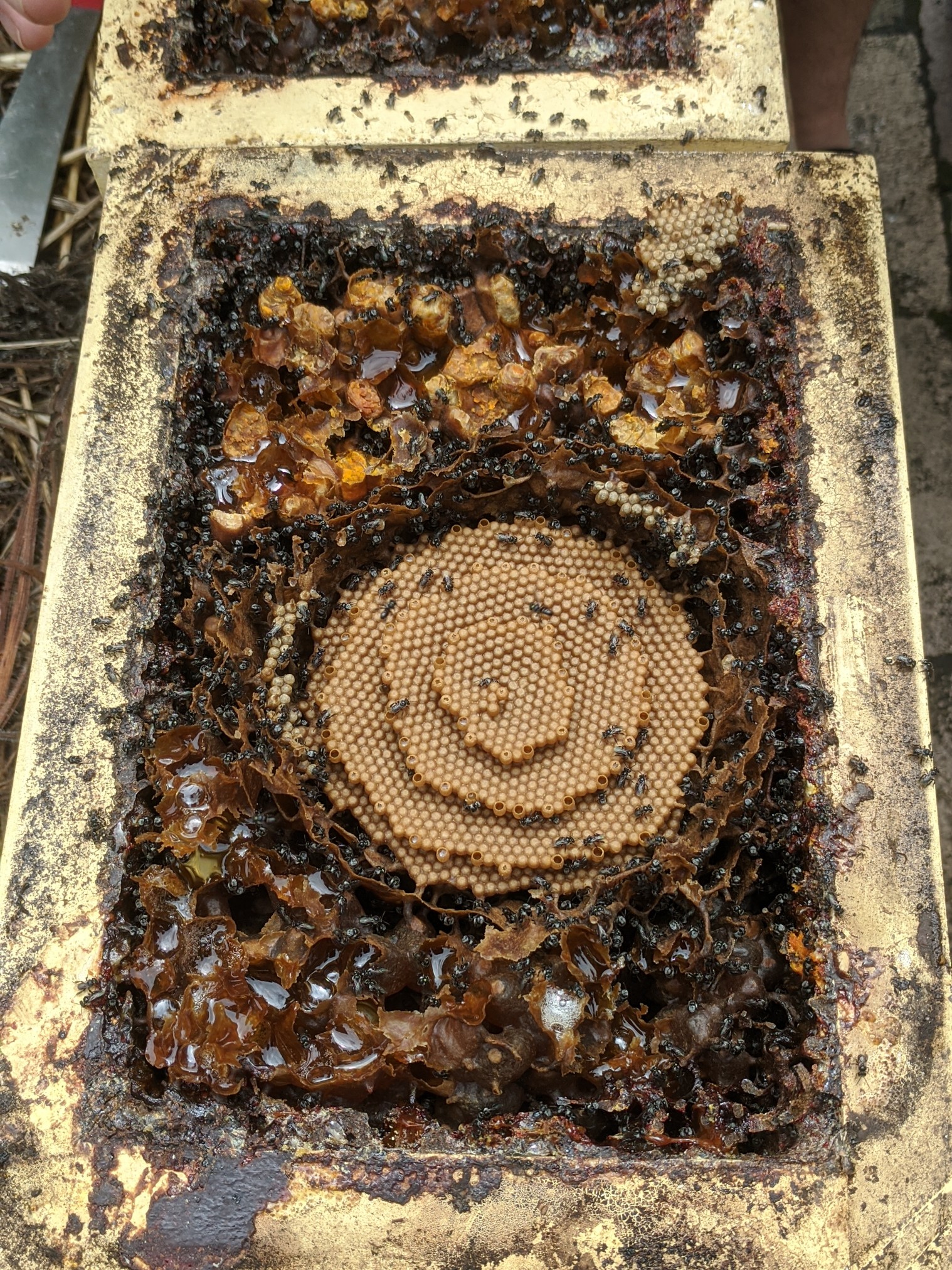 Each hive or nest has a queen, drones and thousands of workers. These bees produce sugarbag honey, a highly prized food of Aborigines who gathered it from wild nests. The brood of the TC bees form a very particular spiral pattern.