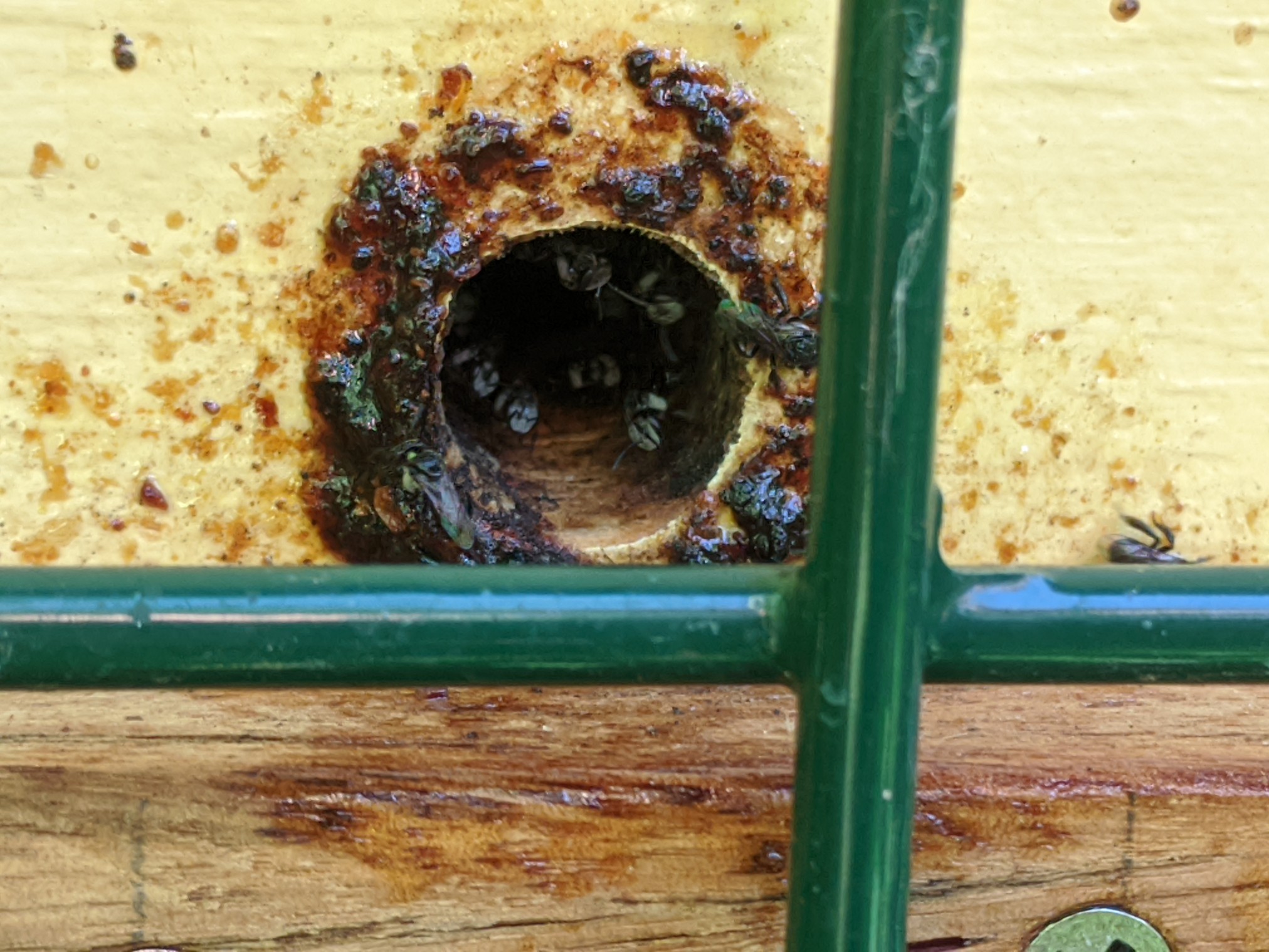 These bees do not have a stinger like the European honey bees and are therefore save to approach and even have them land on you.